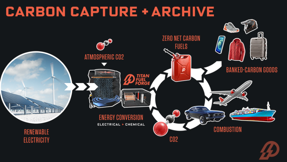 Reverse combustion separates alcohols from water in its trademark Titan Fuel Forge – an electrochemical stack – to give out fuel and oxygen and clean the air around the forge. Through a four-part process, the molecules are captured, sorted and combined with electricity from solar and wind energy to produce zero net carbon fuels.